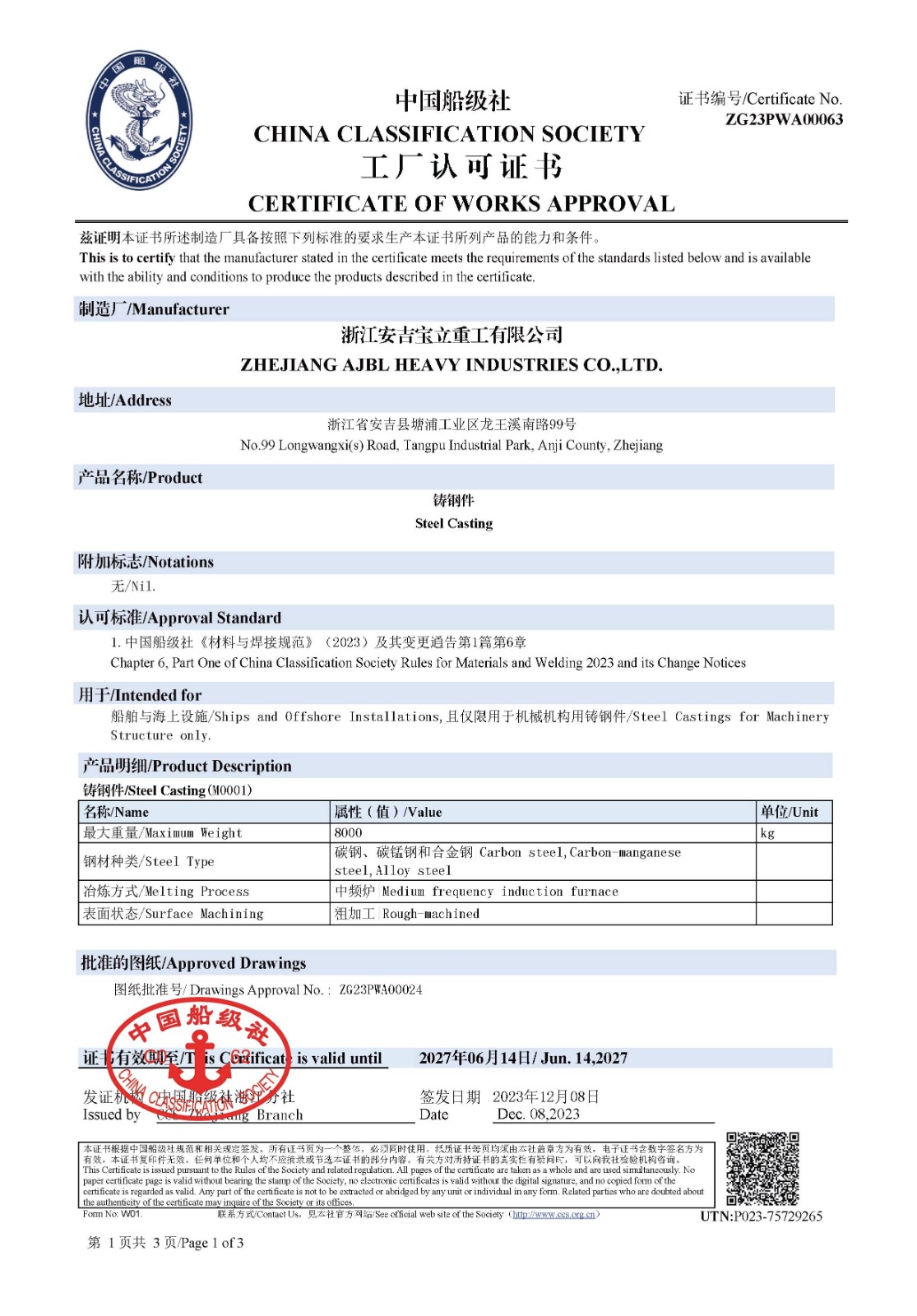 CCS船級(jí)證書